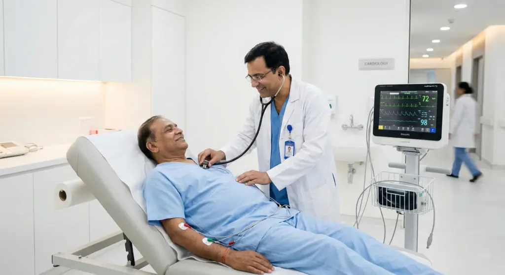 Heart health screening including ECG and cholesterol evaluation.